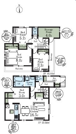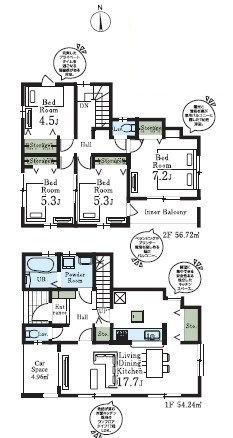 部屋 | 1F LDK 17.0帖 、1F S(納戸) 3.0帖 、2F 洋 7.8帖 、2F 洋 6.5帖 、2F 洋 6.0帖 |